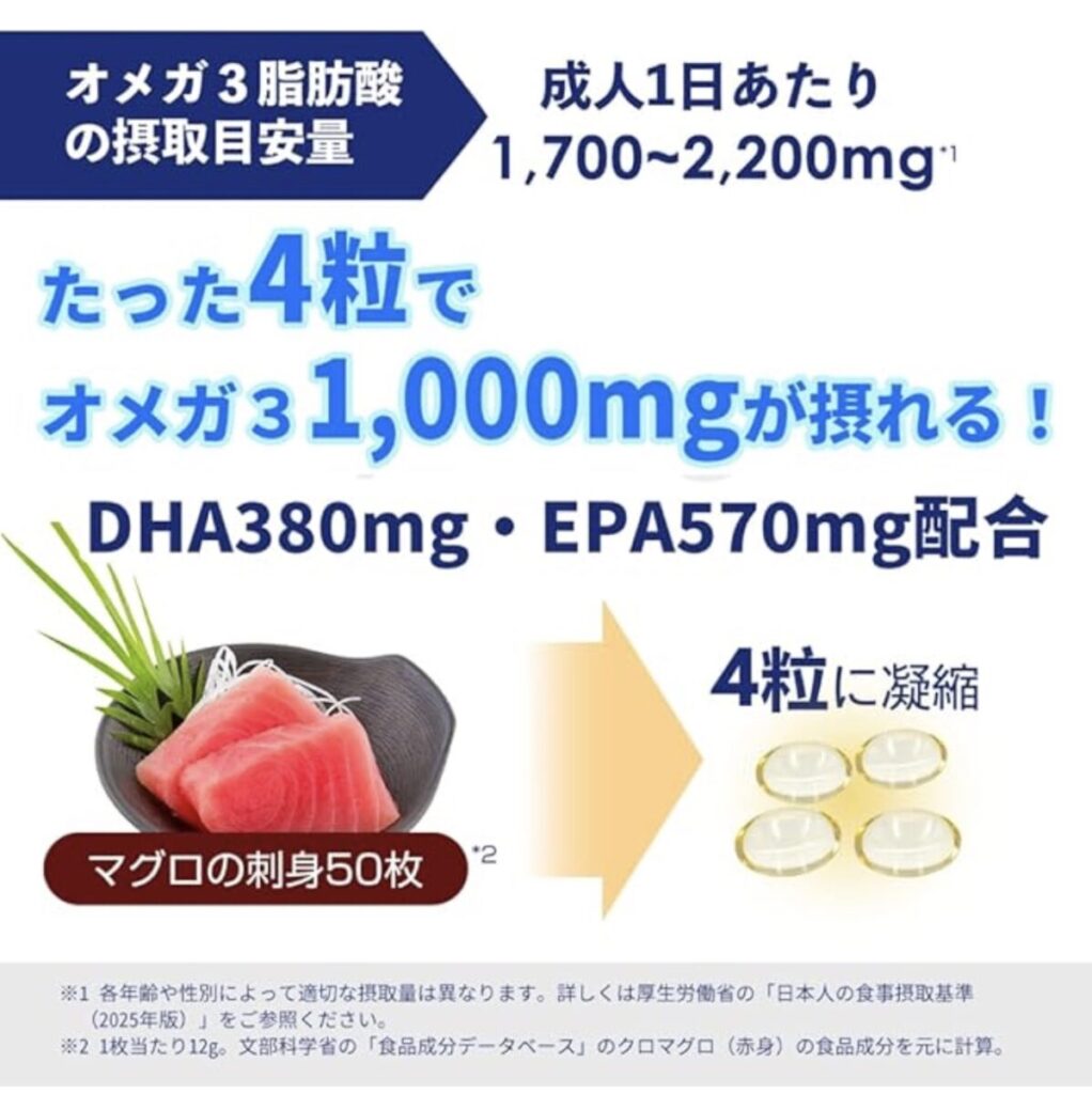 - DHA+EPA 合計950mg、オメガ3 1,000mg配合
